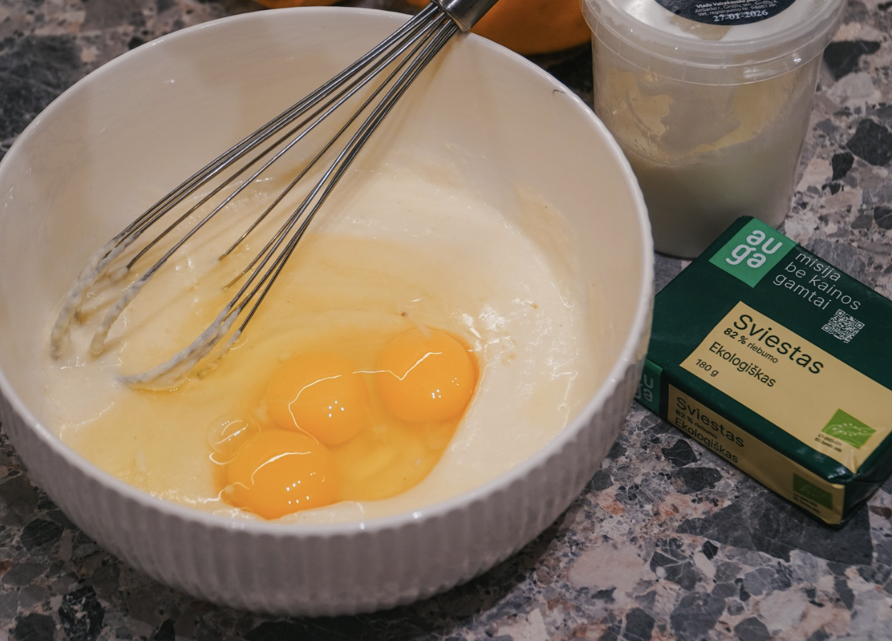 - 1. Dideliame dubenyje sumaišyk graikišką jogurtą, kiaušinius, tirpintą svietsą ir vanilės ekstraktą.