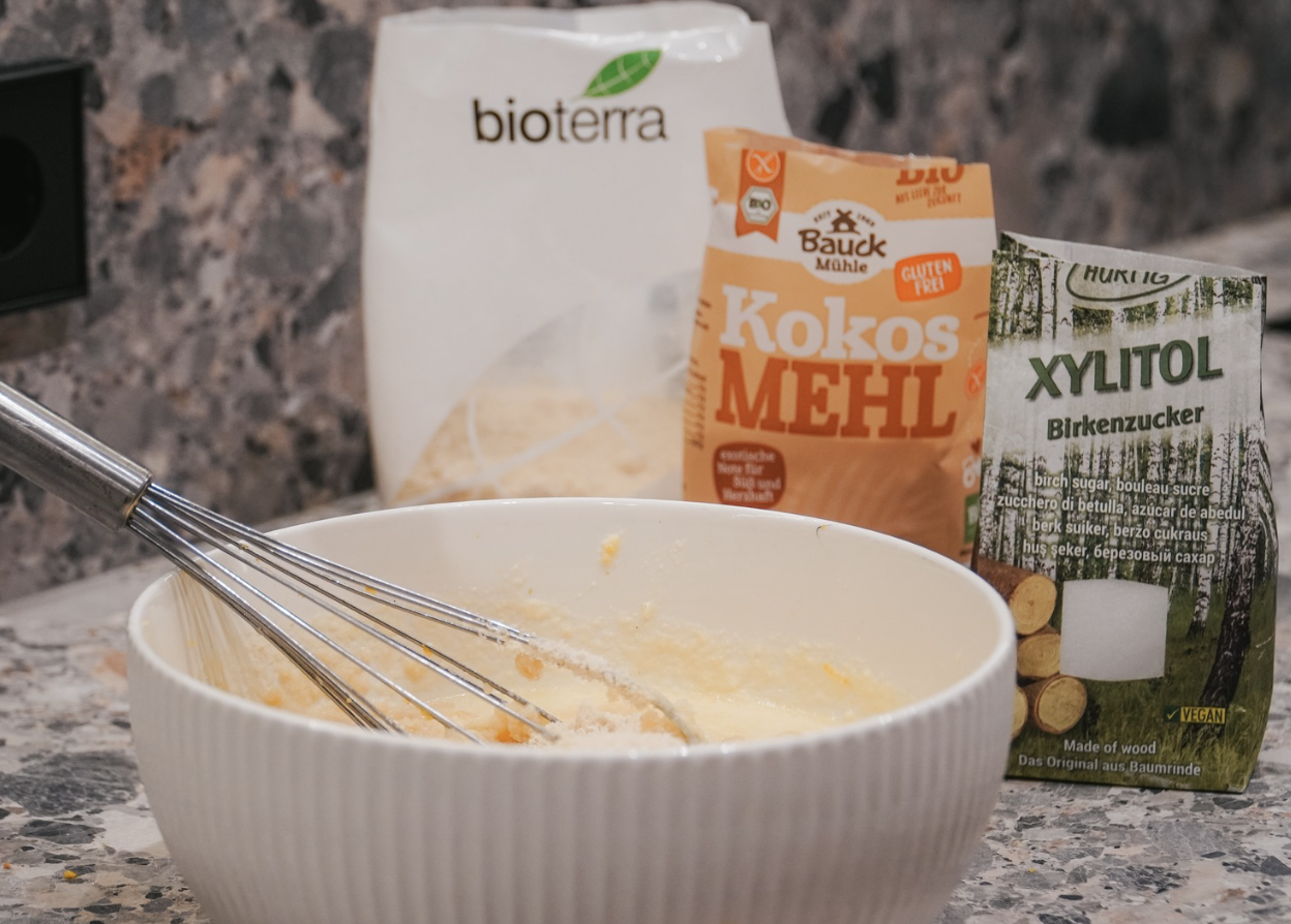- 3. Sudėk likusius sausus kekso ingredientus (migdolų bei kokosų miltus, saldiklį, kepimo miltelius) ir atsargiai sumaišyk, kol visi ingredientai susijungs į vientisą masę. Stenkis nepermaišyti!