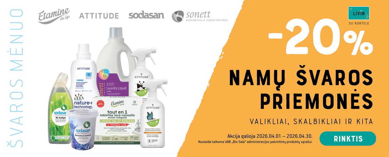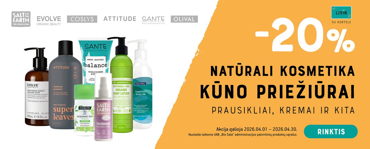 LIVIN internetinė parduotuvė - viskas, ko reikia sveikesniam gyvenimo būdui, vienoje vietoje. Mūsų platų maisto, grožio ir namų apyvokos produktų asortimentą sudaro sveikas ekologiškas maistas visai šeimai, ekologiškos skalbimo priemonės, padedančios rūpintis mus supančia aplinka ir natūrali kosmetika kūnui, veidui ir plaukams. LIVIN internetinėje parduotuvėje taip pat rasi sveikatai ir gerai savijautai skirtų produktų, pavyzdžiui, ekologiškų maisto papildų. Rūpinkis savo ir savo šeimos gerove kasdien - rinkis sveikatai bei aplinkai palankius produktus iš didžiausios internetinės ekologiškų prekių parduotuvės LIVIN!