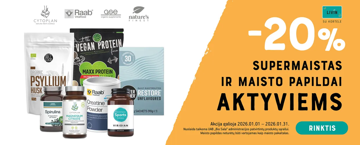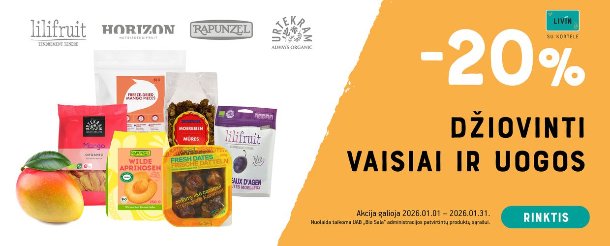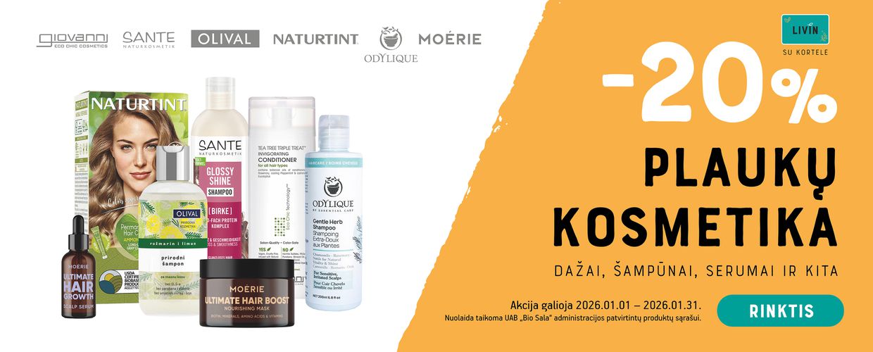 LIVIN internetinė parduotuvė - viskas, ko reikia sveikesniam gyvenimo būdui, vienoje vietoje. Mūsų platų maisto, grožio ir namų apyvokos produktų asortimentą sudaro sveikas ekologiškas maistas visai šeimai, ekologiškos skalbimo priemonės, padedančios rūpintis mus supančia aplinka ir natūrali kosmetika kūnui, veidui ir plaukams. LIVIN internetinėje parduotuvėje taip pat rasi sveikatai ir gerai savijautai skirtų produktų, pavyzdžiui, ekologiškų maisto papildų. Rūpinkis savo ir savo šeimos gerove kasdien - rinkis sveikatai bei aplinkai palankius produktus iš didžiausios internetinės ekologiškų prekių parduotuvės LIVIN!
