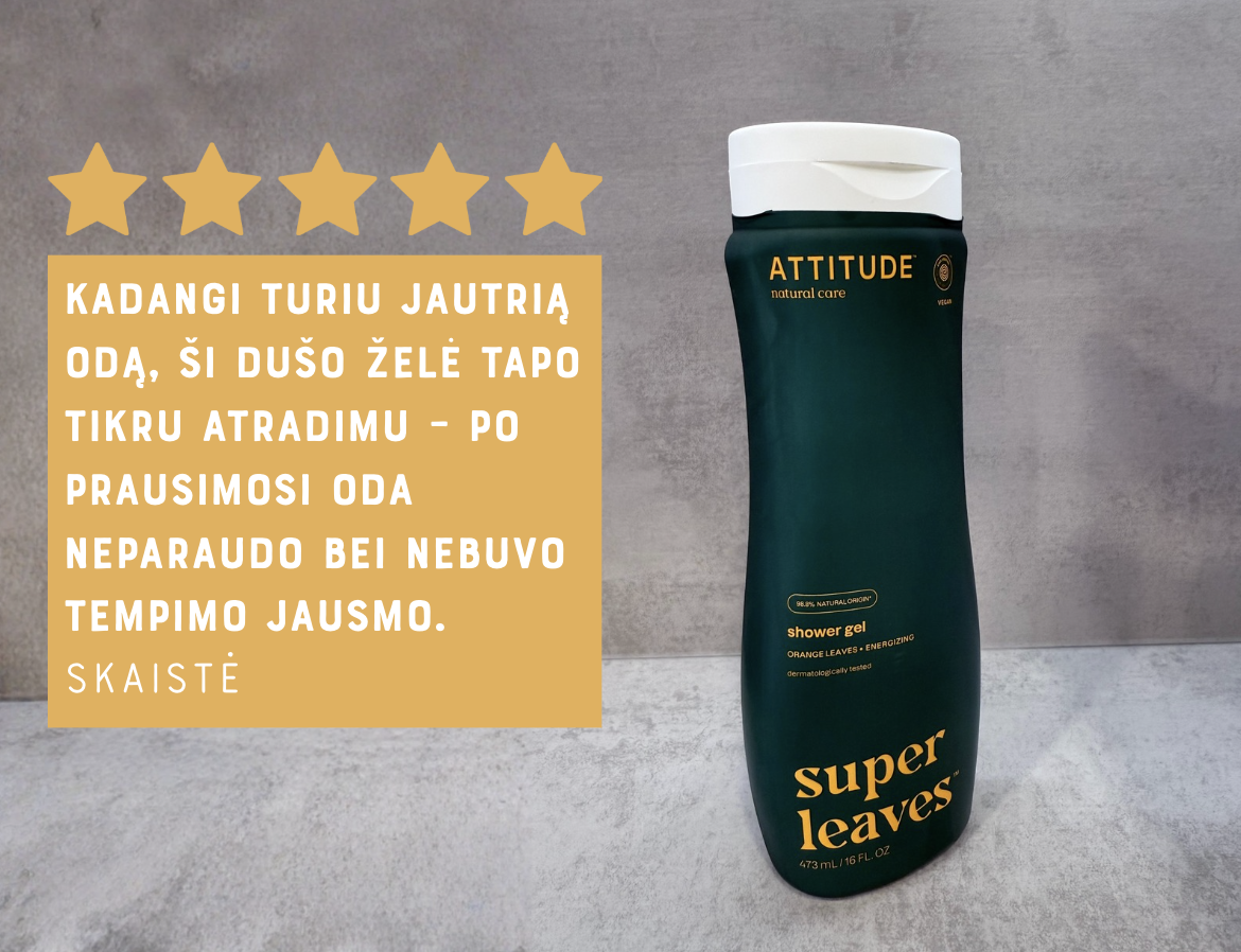 Kai kuriuos ATTITUDE produktus mūsų šeima naudoja jau ne vienerius metus, tačiau buvo smagu išbandyti ir kitus šio prekių ženklo gaminius. Mūsų su vyru naujas atradimas – rankų muilas. Šaltuoju metų laikotarpiu mano delnai tampa jautresni, dirglesni bei – be reikiamos priežiūros – paūmėja dermatitas, todėl labai apsidžiaugiau pamačiusi, koks šis rankų muilas švelnus ir saugus. Naudojau jį kasdien, o oda liko nesudirginta! Vienareikšmiškai 10 iš 10 – tiek savo sudėtimi, tiek poveikiu. Išbandžiau ir ATTITUDE dušo gelį, kuris švelniai pašalino nešvarumus. Labai patiko, jog nusiprausus, oda neišsausėjo. Vyrui pritrūko putojimo efekto, bet man šis produktas pasiliks tarp prausimosi priemonių ilgam, nes yra hipoalerginis. Pastebėjau, kad nusiprausus šiuo dušo geliu neatsiranda dilgėlinės bėrimų, priešingai nei su kitomis priemonėmis, kurias esu išbandžiusi. Tokias hipoalergines, saugias prausimosi priemones man sudėtinga surasti ir pritaikyti savo jautriai odai.