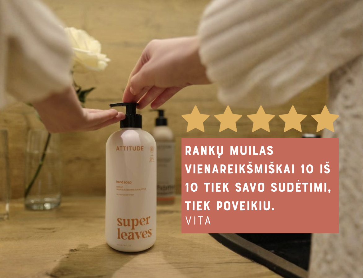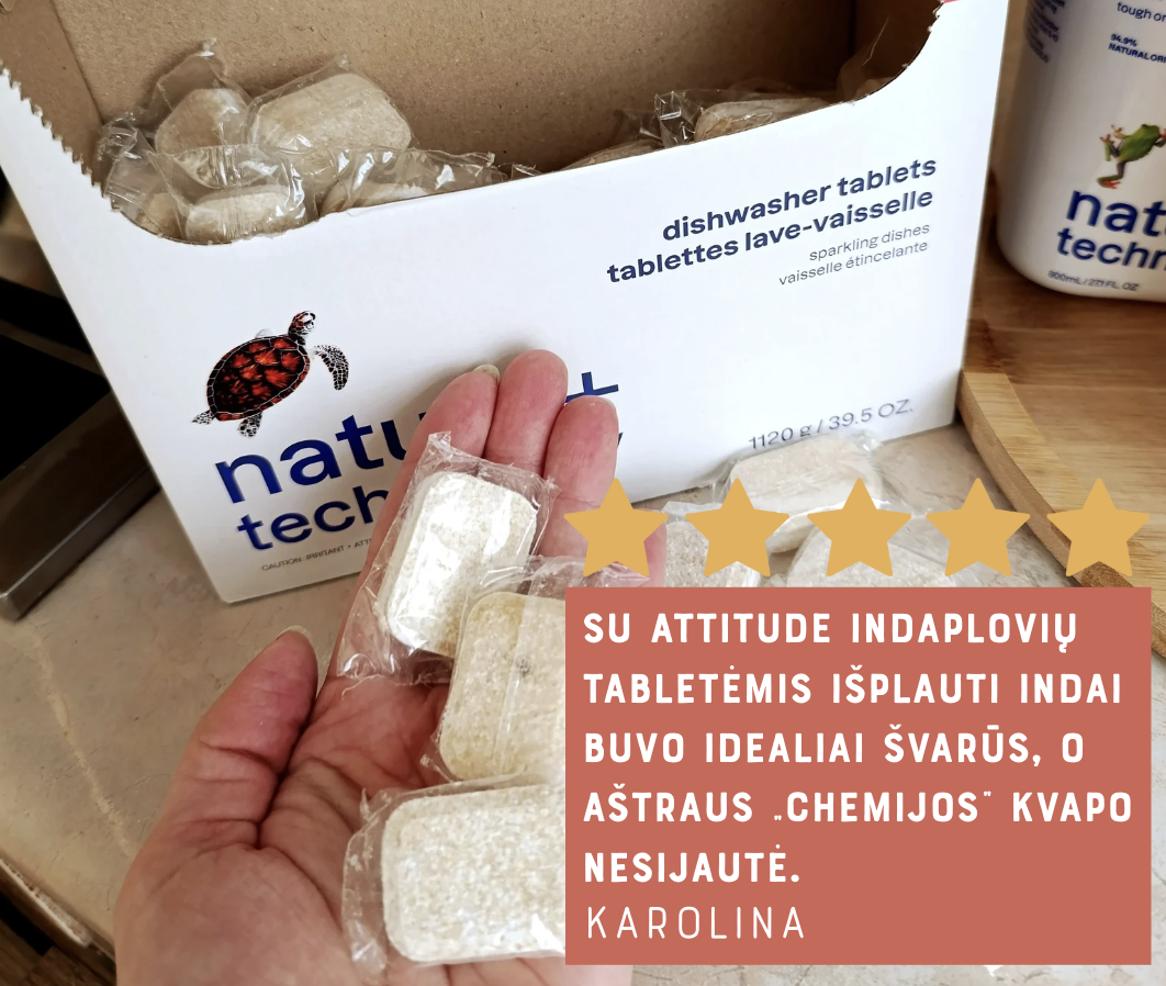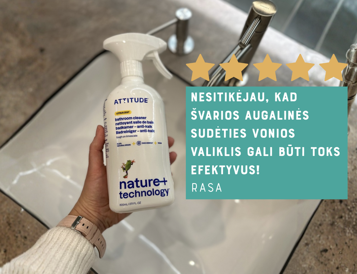 Atsakingai renkuosi namų švaros priemones, vengiu bet kokių kvapų, tad bekvapiai ATTITUDE produktai – tikras išsigelbėjimas. Nesitikėjau, kad švarios augalinės sudėties vonios valiklis gali būti toks efektyvus! Jis puikiai išvalė įsisenėjusias kalkių ir muilo dėmes vonios kambaryje bei virtuvės kriauklėje. ATTITUDE indaplovių tabletės puikiai išplovė indus, nepaliko jokių nuosėdų, o stikliniai indai buvo švarūs ir blizgūs, kai nuo daugelio kitų priemonių jie lieka dėmėti.