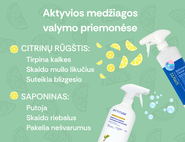 Pavyzdžiui, „Attitude“ purškiamo vonios valiklio sudėtyje esantis saponinas yra galingas augalinės kilmės junginys, turintis natūralių putojimo ir valymo savybių. Taip pat, natūraliais, bet efektyviais valikliais laikomi tie, kurių sudėtis praturtinta citrinos rūgštimi. „Sonett“ purškiamas vonios valiklis su citrinos rūgštimi greitai ir efektyviai pašalina kalkių nuosėdas, muilo likučius ir kitus dušo kabinos ar vonios nešvarumus. Tad net augalinės sudėties valikliai gali būti ne tik veiksmingi, bet ir saugūs.