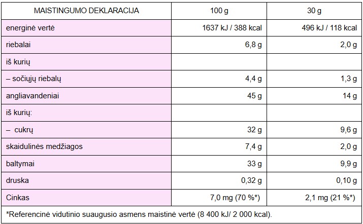 Produktas turi daug baltymų ir skaidulinių medžiagų ir yra cinko šaltinis. Cinkas reguliuoja riebalų apykaitą, padeda palaikyti normalią maistinių medžiagų apykaitą ir rūgštinę-bazinę apykaitą. Norint pasiekti deklaruotą naudingą poveikį, kasdien reikia suvartoti 15 % rekomenduojamo cinko kiekio: 1 porcija (30 g) turi tokį kiekį (pakuotėje yra 10 porcijų).