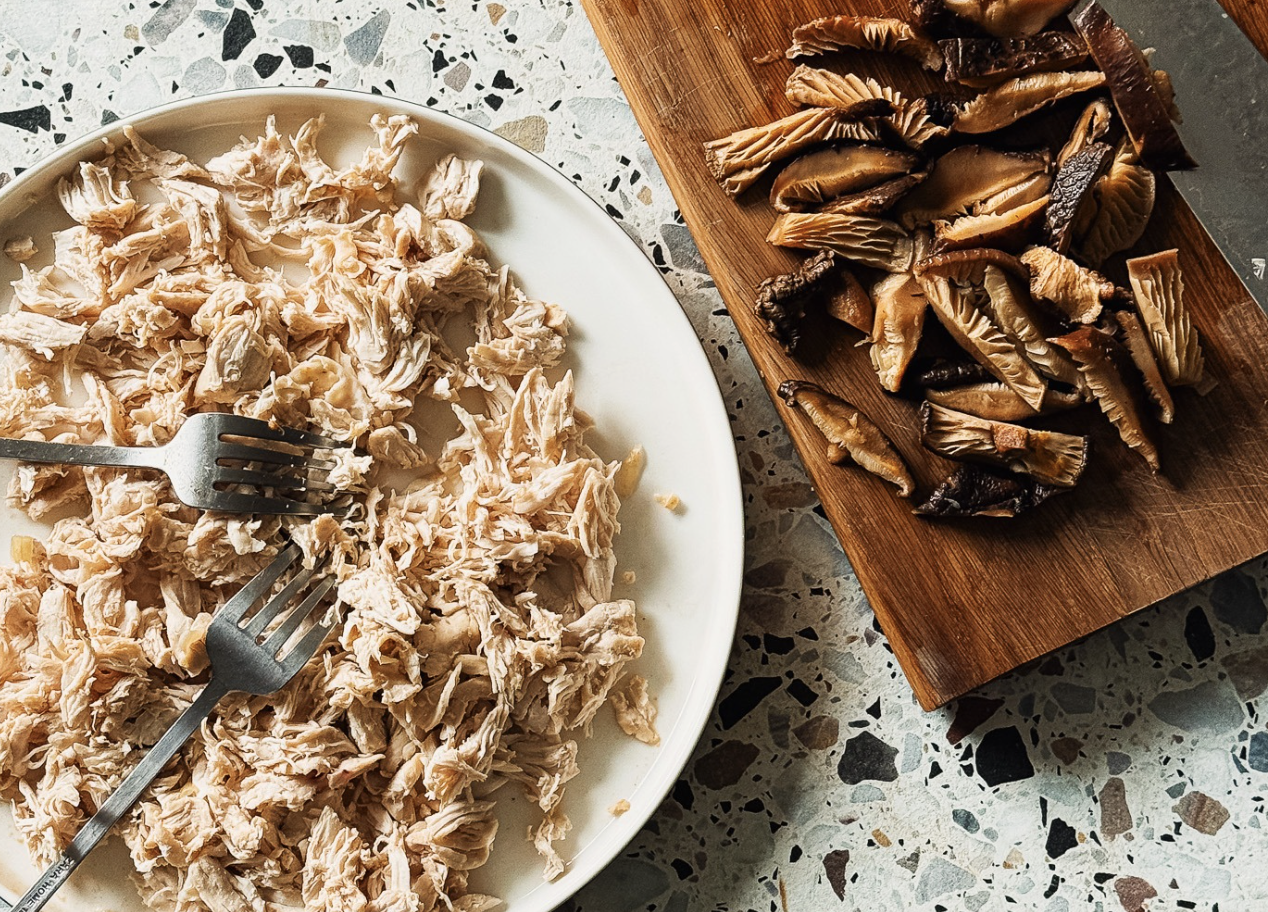 - 5. Vištieną ir shiitake grybus išgriebiu. Vištieną suplėšau šakute, o grybus supjaustau plonomis riekelėmis. Grąžinu į puodą.