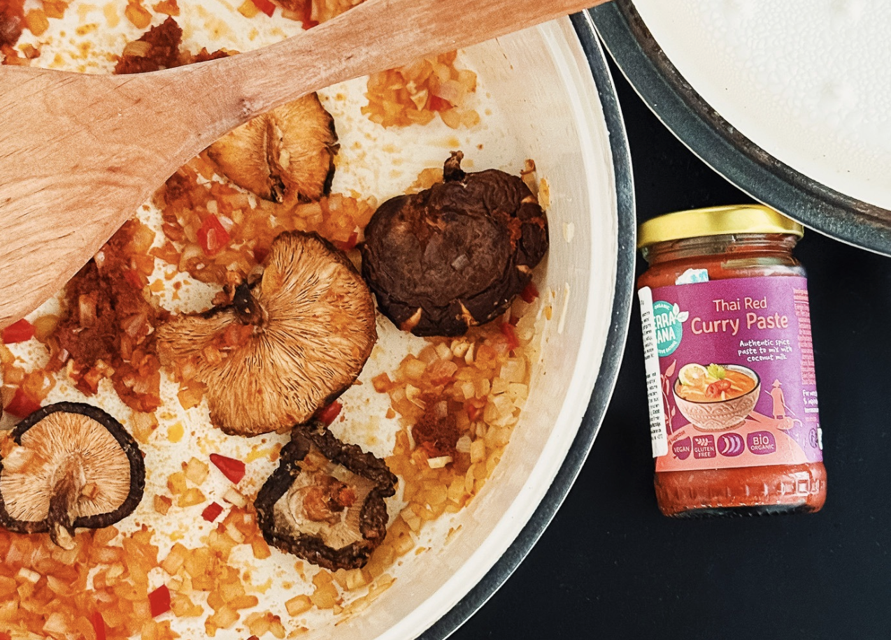 - 2. Dideliame puode įkaitinu kokosų aliejų. Dedu svogūną, česnaką ir aitriąją papriką. Maišydama pakepinu 2-3 min. Įtarkuoju imbiero šaknį ir maišydama pakepinu apie 1 min. Dedu shiitake grybus, raudoną kario pastą ir maišydama pakepinu dar apie 1 min. (iki pasklinda malonus kvapas).