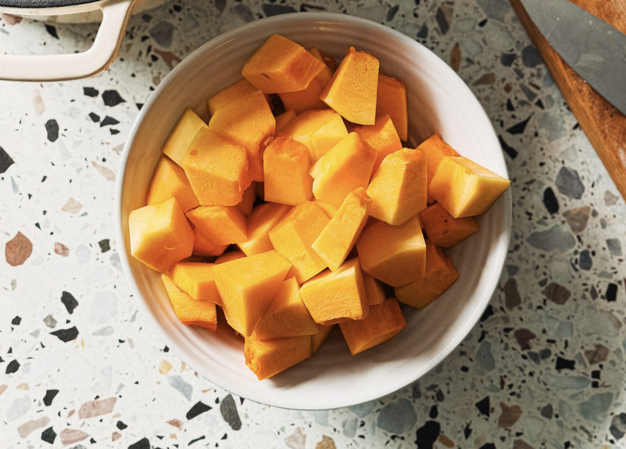 - 3. Moliūgą supjaustau 2-3 cm skersmens kubeliais ir dedu į puodą drauge su vištiena ir sultiniu.