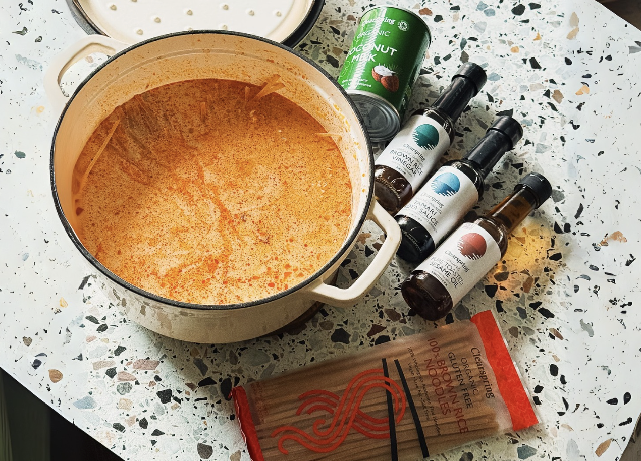 - 6. Į puodą supilu kokoso pieną, sojos padažą ir ryžių actą. Dedu ryžių makaronus. Viską išmaišau ir vėl pakaitinu iki beveik užverda, tada kaitrą išjungiu, įmaišau skrudintų sezamų aliejų ir uždengus palieku pastovėti apie 10 min (arba iki makaronai suminkštėja).