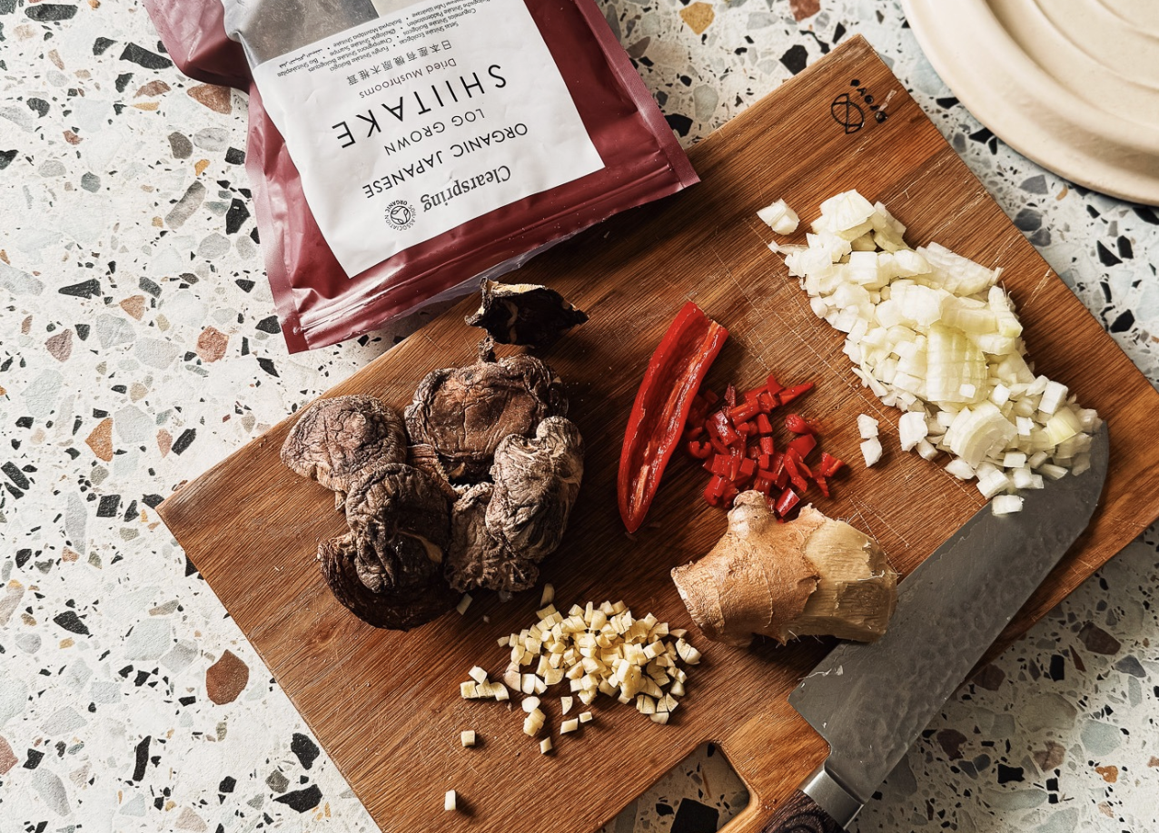 1. Pasiruošiu ingredientus: shiitake grybus, jei spėju, pamirkau šaltame vandenyje 20-30 min. iki gaminant, bet, jei laiko nėra, gaminu tiesiog su džiovintais. Svogūną smulkiai supjaustau, česnaką ir aitriąją papriką smulkiai sukapoju, imbiero šaknį nusilupu.