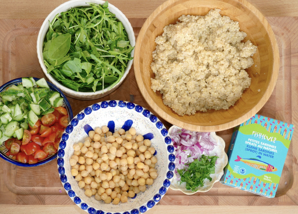- 3. Į didelį dubenį sudėk atvėsusią bolivinę balandą, smulkintas daržoves, nuskalautus, nusausintus avinžirnius, smulkintas žoleles. Prieš patiekiant ant viršaus sudėk sardines.