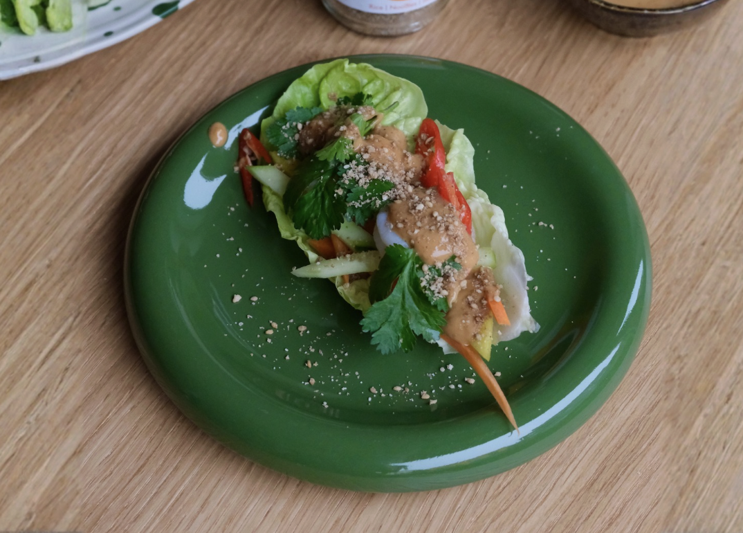 Šviežių daržovių ir krevečių laiveliai su umami žemės riešutų padažu